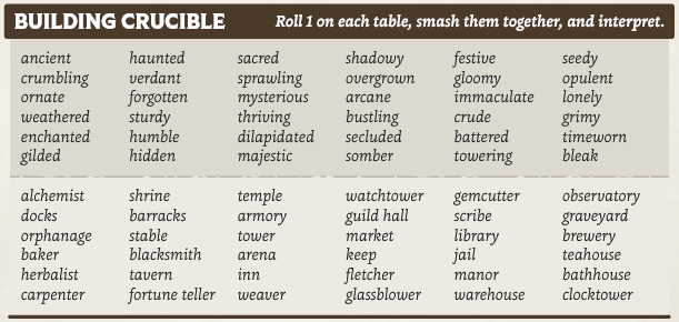 Wenn etwas auf die Karte gesetzt wird, muss es auch gelabeled werden. Ein paar Schlüsselwörter oder ein Name ist ausreichend. Die Crucibles auf Seite 88 des Regelwerks können mit der Inspiration helfen. Zusätzlich zum Namen kann auch ein Tag mit [Remnants], [Wilds] oder [Ruins] vergeben werden, um die Realität zu definieren, mit welcher der Ort in Verbindung hängt.