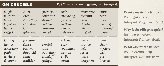 Das GM Crucible sind 2 d66 Tabellen, welche zusammen die Inspiration für Low-Prep und Improvisation anregen sollen. Kann auch gemeinsam mit Story Rolls verwendet werden. Die Würfe ergeben immer zwei Ergebnisse (1 + 3 = 13 oder 31).
