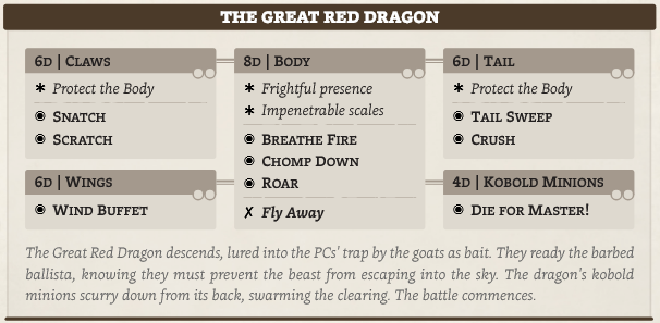 Consequences: Jeder Wurf trägt Risiko mit sich, ist kein Risiko vorhanden wird Erfolg angenommen und weiter gemacht. Konsequenzen für schlechte Würfe sollten hart aber fair sein. Schaden bietet eine gute Baseline und kann weiter aufgesplittet werden.