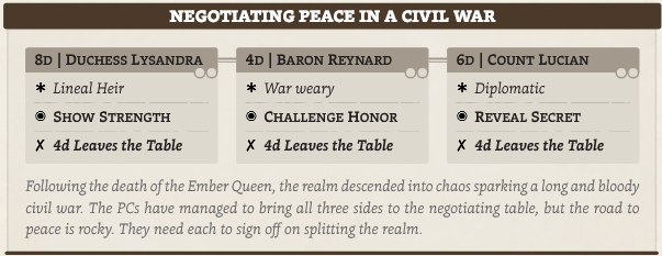 Wenn ein Faction Pool geleert wird, erreichen sie entweder ihr Goal oder machen einen Move gegen eine andere Faction mit einer Story Roll.