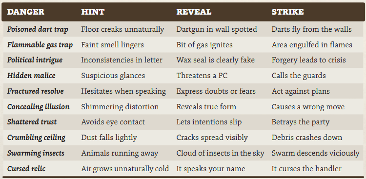 | Foreshadow | Auf Gefahr hinweisen, manchmal mit einem Timer Pool. Führt später zu einem Impact Move. | “The wizard narrows his eyes angrily as you enter.” “You hear hoofbeats coming, a 4d timer.” |